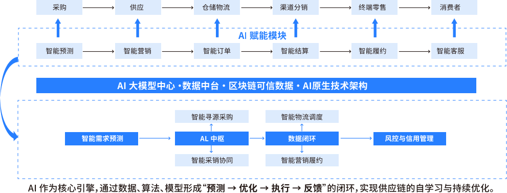 AI深度融入产业供应链,构建可感知、可预测、可决策、可优化的智能化体系,助力企业实现供应链提效与生态协同。