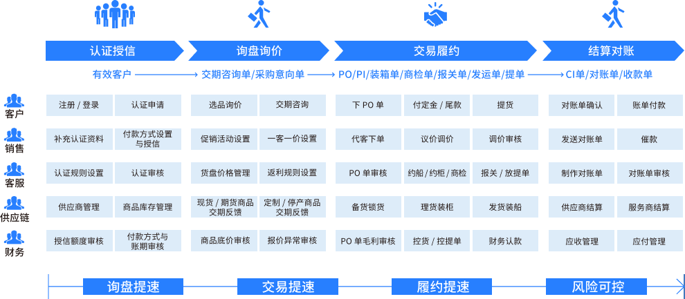 跨境出海产业供应链平台,帮助国内企业供应链出海,实现业务在线化、标准化、自动化,促进业务效率提升与业务风险可控。