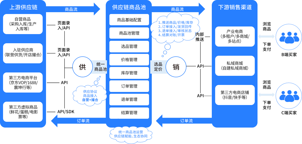 以供应链商品池为核心、打通上下游系统的智能供应链协同平台,实现商品、库存、订单、结算等全链路自动化与多渠道同步。