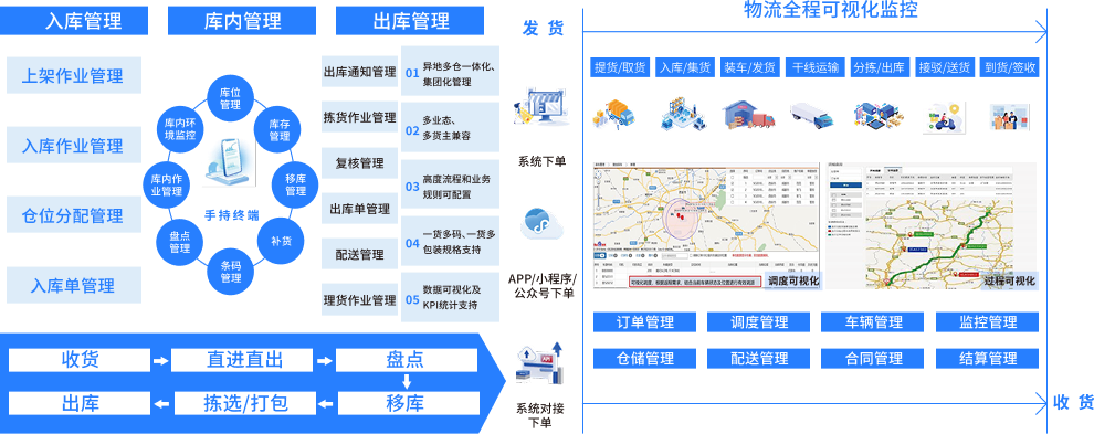 提供智能化的仓储管理服务,实现多仓储之间的高效协同,提高效率,降低物流仓储成本。异地多仓平台统一管理、先进的仓内作业算法、支持与自动化、智能化设备深度集成。 全流程的物流信息化服务,实现物流交易撮合、物流运输跟踪、车辆管理、计费结算,订单管理对接等“一站式、一体化”服务,提高物流生态的全方位流通效率、 降低物流仓储成本。
