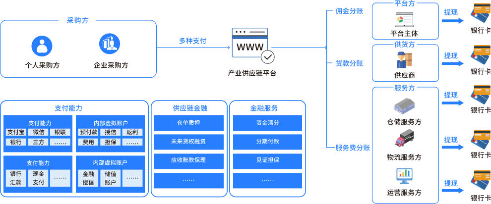 满足产业供应链平台各类支付及金融场景,支持多种支付方式、为上下游提供多样化供应链金融能力、对接金融机构提供各类金融服务,缓解各方资金压力、加速资金流转。