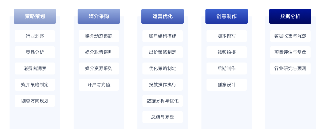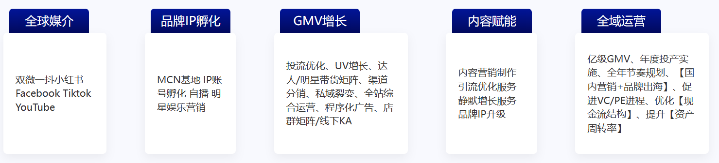 整体代运营、达播明星经纪、媒介内容种草、媒介采买、
