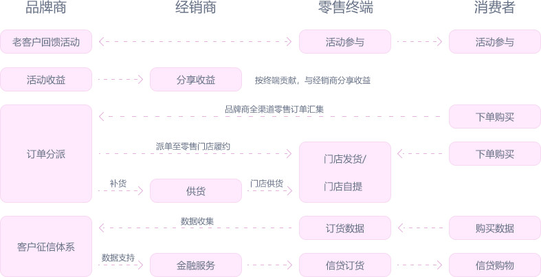 面向经销商和终端的订货业务形成数字化管理化,可将品牌商面向经销商和终端的营销传播纳入统一管理, 同时为零售终端提供在线销售应用