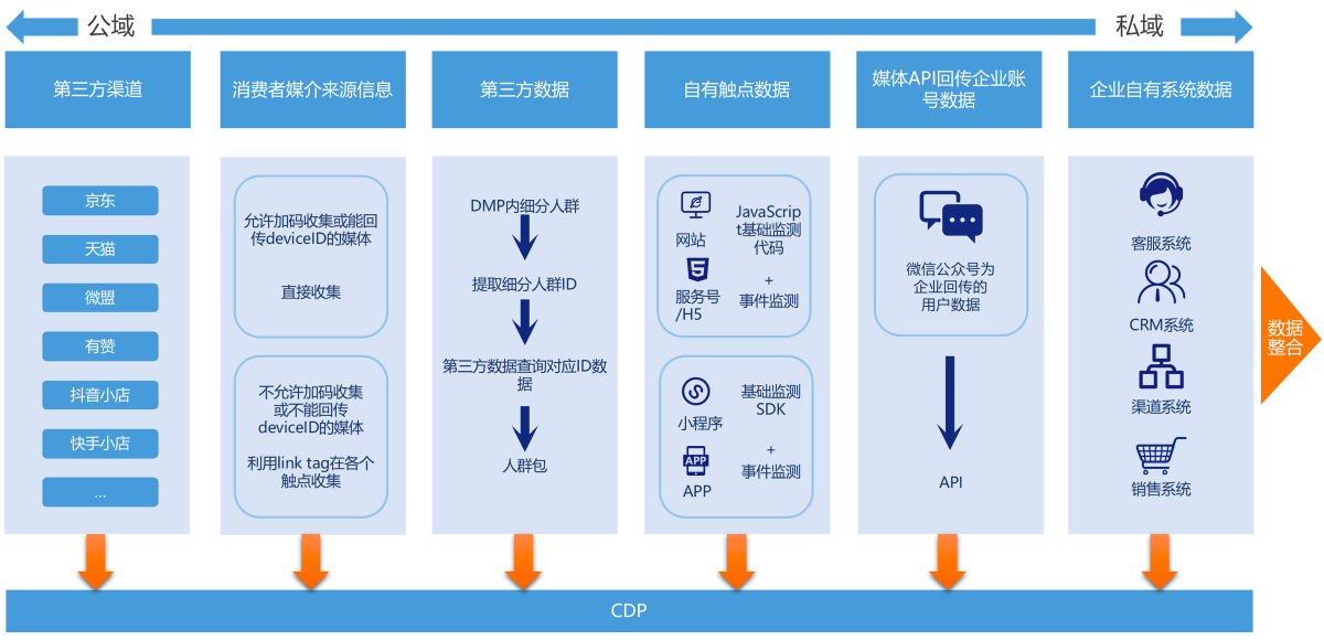 同时支持京东、淘宝、公众号、抖音等三方平台在内的公域渠道数据与自有商城、业务系统、订货平台、线下门店等自有私域渠道数据的接入。