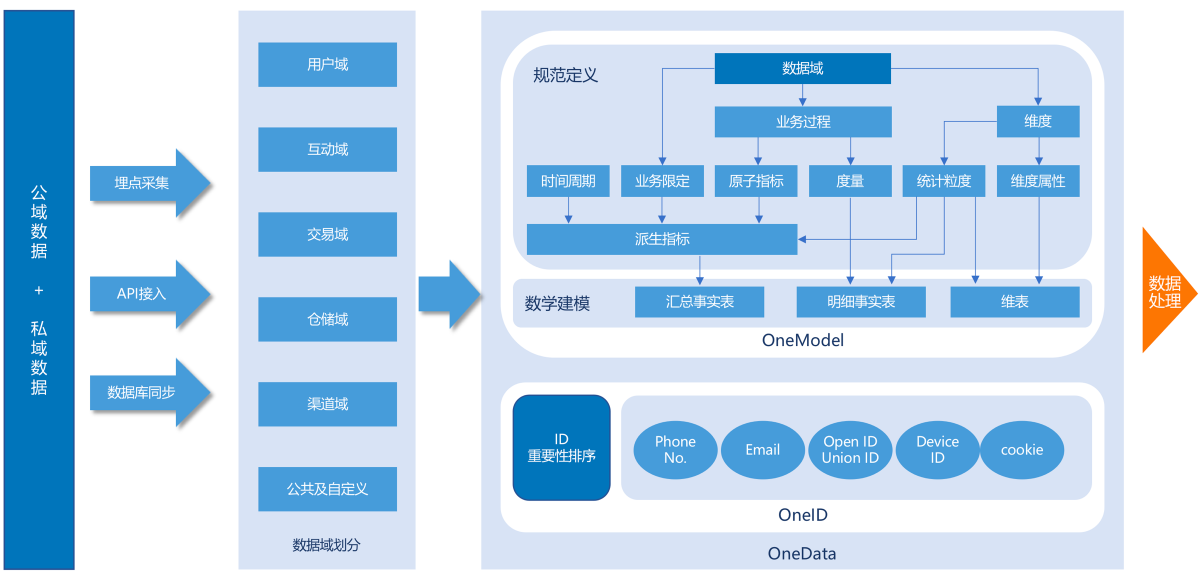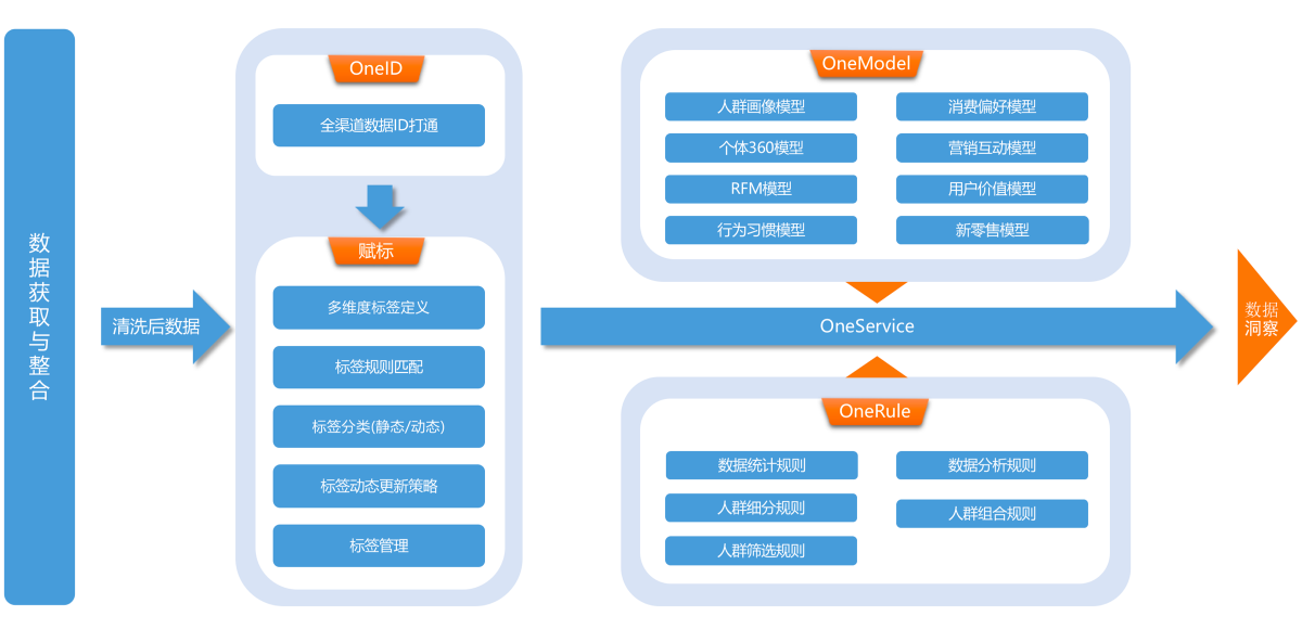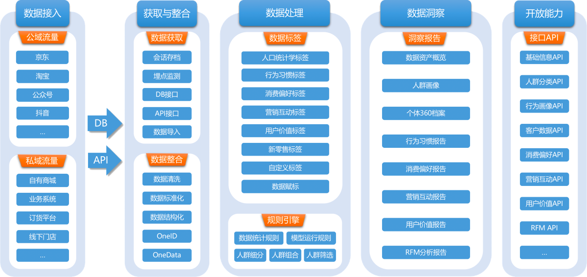 通过API、DB以及数据导入的方式,采集所有消费者与企业的多触点交易、商务行为数据,通过对数据进行清洗、重组,整合为One ID的数据。