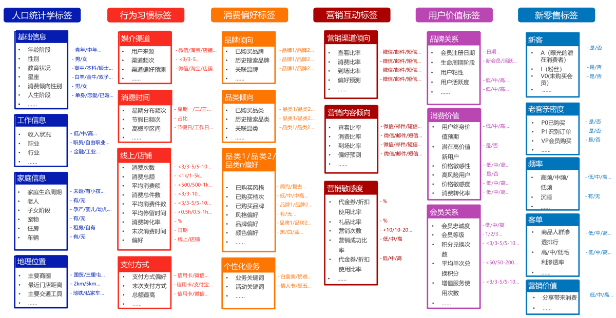 按用户域(会员信息)、互动域(买点互动信息)、交易域(交易记录)、仓储域(仓储发货)、渠道域等进行分区以及多维度的整合,后完成ID的统一。