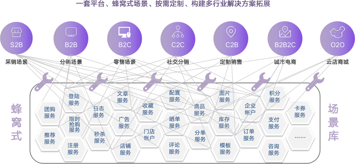 讯腾软件垂直电商系统基于互联网中台架构、微服务、蜂窝式场景等技术,支持根据企业的需求定制开发,随需拓展,满足各行业各场景的个性化需要