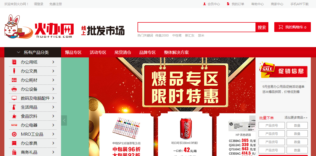 4、供应商入驻平台,提供符合条件的办用用品供应商入驻火办网商城,入驻商家可免费享受火办网网在全国铺开的仓储物流系统。