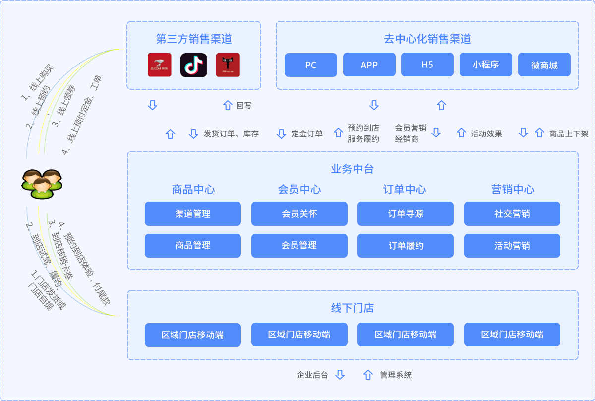 基于中台能力实现公私域业务融合,全渠道商品、会员、订单、库存等统一管理,构建零售业务闭环
